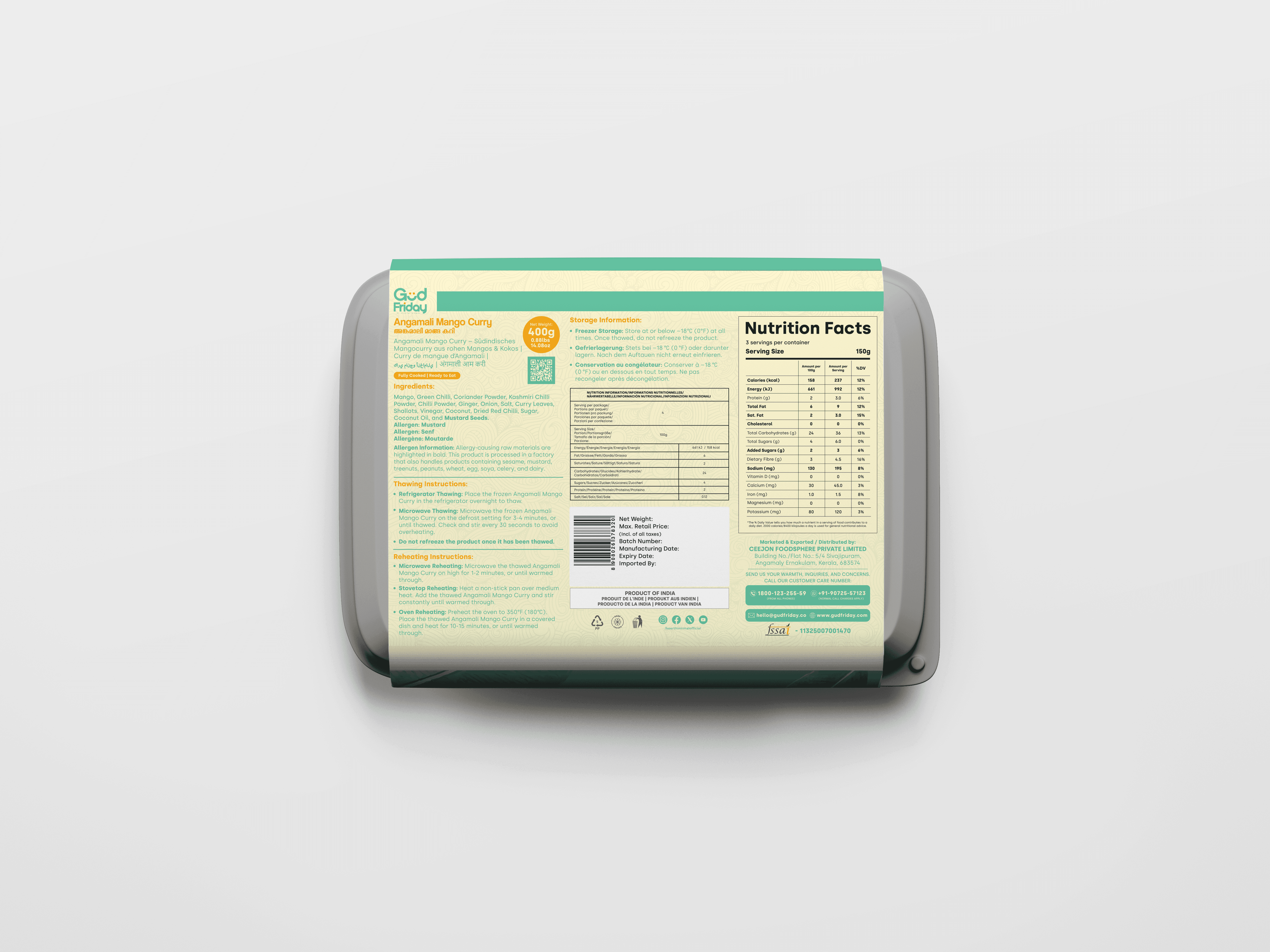 Preheat the oven to 350°F (180°C). Place the thawed Angamali Mango Curry in a covered dish and heat for 10-15 minutes, or until warmed through.