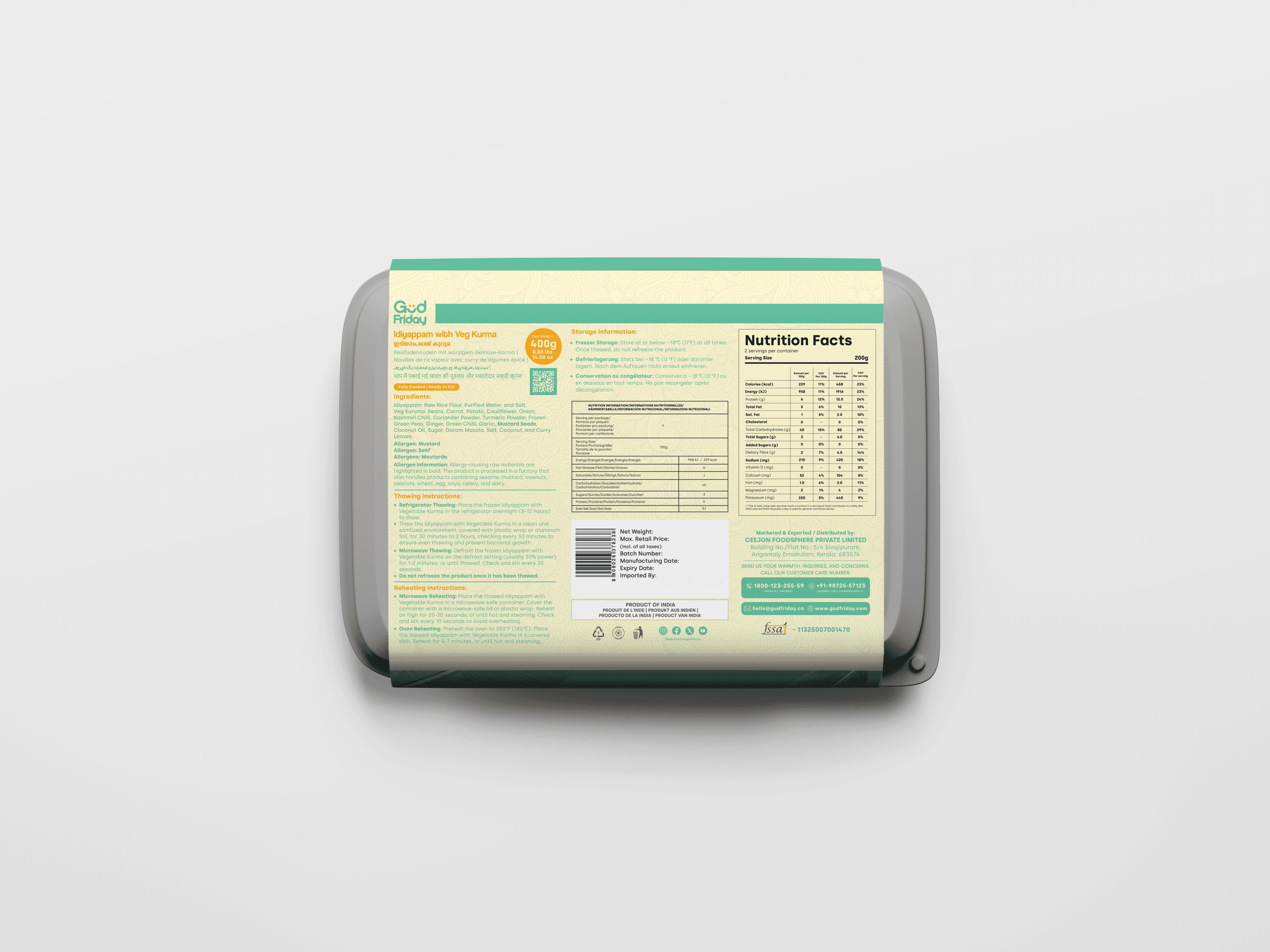Place the thawed Idiyappam with Vegetable Kurma in a microwave-safe container. Cover the container with a microwave-safe lid or plastic wrap. Reheat on high for 20-30 seconds, or until hot and steaming. Check and stir every 10 seconds to avoid overheating.