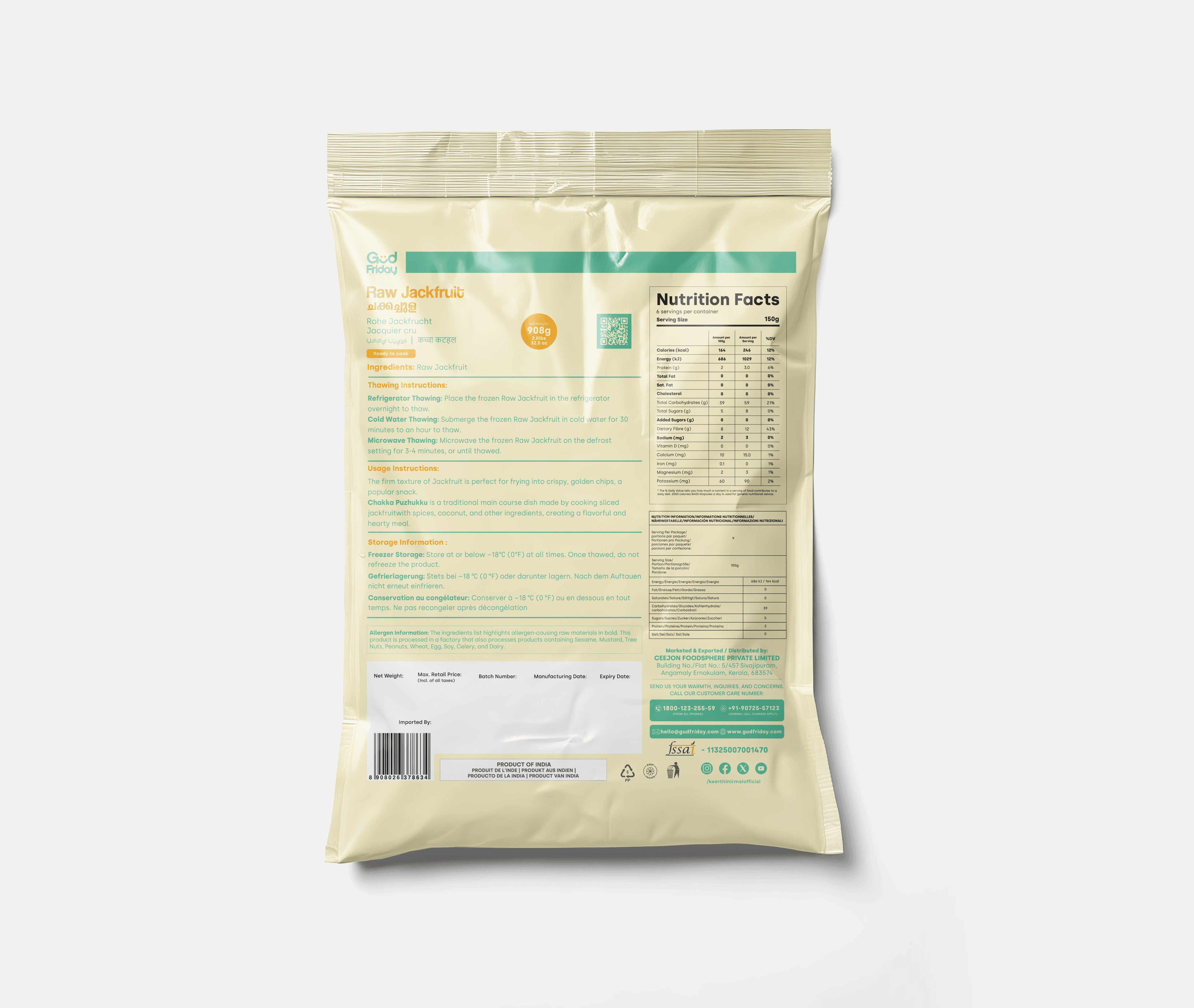 Raw Jackfruit is cleaned and cut into usable pieces, ideal for a variety of savoury dishes. A staple ingredient in many Kerala-style preparations.
